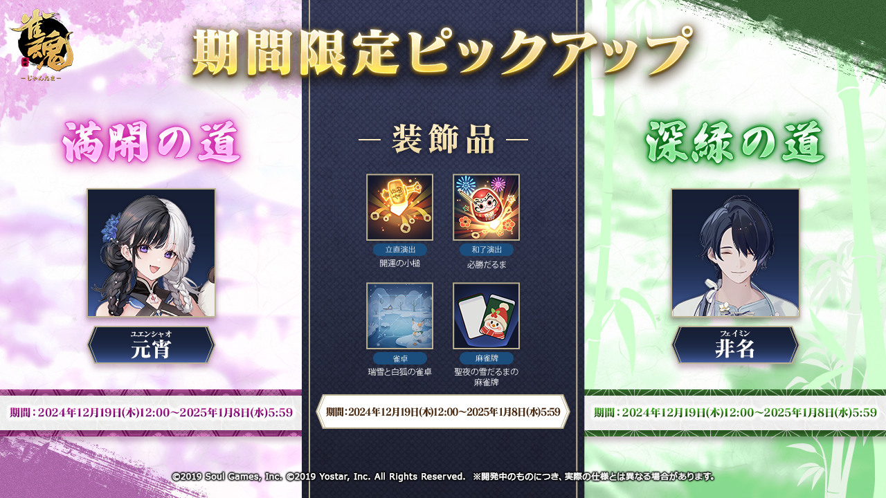 ☆ピックアップ☆新雀士「元宵(ユエンシャオ)」「非名(フェイミン)」、「特定雀士多数」(2024年12月19日(木)~1月8日(水)5:59)